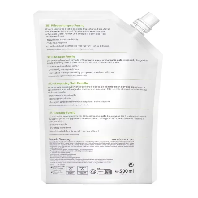 La composition de ce shampoing s'appuie sur la richesse de la nature avec des extraits de pomme bio et d'avoine bio. La pomme apporte une sensation de fraîcheur immédiate et une hydratation bienvenue pour maintenir l'équilibre naturel de la fibre capillaire. L'avoine bio est quant à elle reconnue pour ses vertus apaisantes et adoucissantes, aidant chaque membre de la famille à retrouver une chevelure souple et facile à coiffer après chaque lavage.