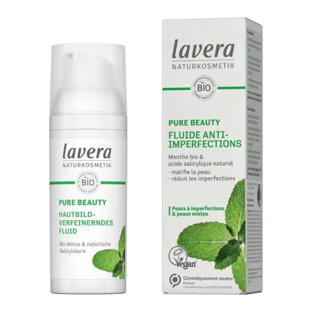 Le Fluide Anti-Imperfections PURE BEAUTY de Lavera matifie la peau, réduit les imperfections et hydrate, pour un teint unifié et éclatant