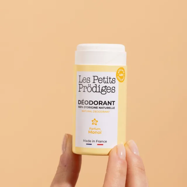 Formulé sans aucun ingrédient synthétique, ce déodorant solide au Monoï Les Petits Prödiges assure une protection efficace de 48 heures tout en respectant votre peau et l'environnement. Sa formule légère et vegan laisse votre peau fraîche et sèche, sans laisser de résidus blancs sur vos vêtements. Son odeur envoûtante au Monoï saura d'autant plus vous convaincre... Adapté à tous les membres de la famille, il convient même aux peaux sensibles dès l'âge de 12 ans (testé sous contrôle dermatologique) Conçu dans un emballage en carton 100% recyclable et compostable, ce déodorant s'inscrit dans une démarche 100% écoresponsable !