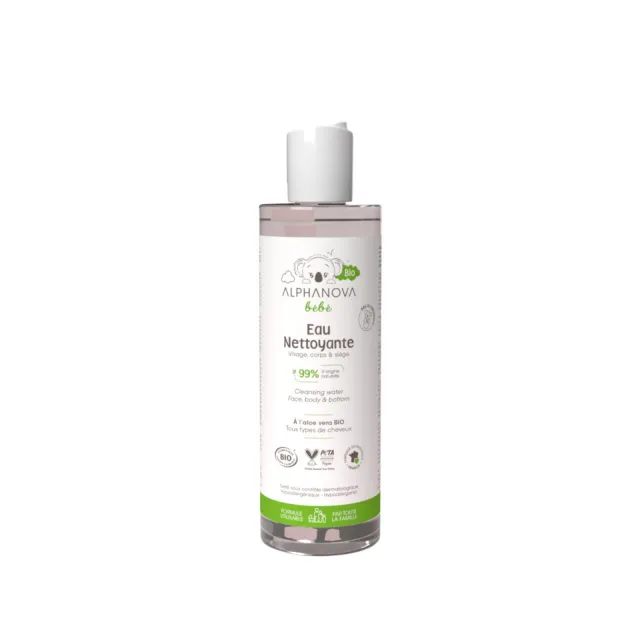 L'eau nettoyante Alphanova Bébé est le soin idéal pour nettoyer en douceur le visage, les mains et le siège de votre bébé dès la naissance. Formulée avec 99% d’ingrédients d’origine naturelle, elle est sans rinçage, non collante et laisse la peau propre, douce et délicatement parfumée à la fleur d’oranger. Hypoallergénique et certifiée BIO, cette eau nettoyante est biodégradable, végan et adaptée à toute la famille pour un usage quotidien.