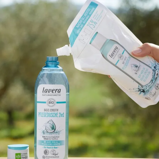 Versez le contenu de la recharge dans votre flacon habituel Lavera propre et sec. Une fois rempli, utilisez comme un gel douche classique : appliquez sur peau mouillée, faites mousser, puis rincez soigneusement. Pour les cheveux, appliquez sur cuir chevelu humide, massez délicatement puis rincez abondamment.