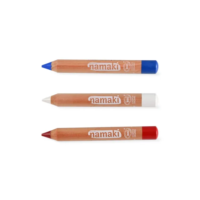 Ce kit de 3 crayons de maquillage pour supporters Bleu, Blanc, Rouge de Namaki vous fera vibrer au rythme des matchs et des victoires ! Conçu pour les enfants et les adultes, ce kit vous permet d’afficher fièrement vos couleurs. Avec leur prise en main facile et leur texture douce, ces crayons vous accompagnent pour encourager votre équipe préférée ou pour un événement festif. Formulés à base d’ingrédients naturels et d’huile de coco BIO, ces crayons sont certifiés Cosmos Organic, respectueux de la peau et de l’environnement.