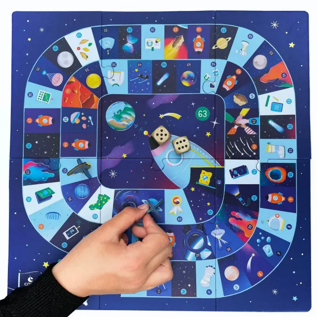 Dépliez le plateau de jeu et placez les pions sur la case départ. Chaque joueur lance le dé à tour de rôle et avance selon le nombre indiqué. Attention aux cases spéciales (trou noir, supernova, etc.) qui peuvent accélérer ou ralentir votre course vers la galaxie finale ! Ce jeu de l’oie se joue de 2 à 6 joueurs et dure environ 20 minutes. À utiliser sous la surveillance d’un adulte. Ne convient pas aux enfants de moins de 3 ans (présence de petits éléments).